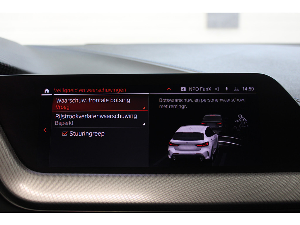Zoals u mag verwachten van deze BMW 1-serie is hij uitgerust met een reeks aan actieve veiligheidssystemen. Verkeersbord-detectie herkent verkeersborden en toont deze op het instrumentarium van de auto. Het Lane-keeping systeem zorgt voor een automatisch constante positie binnen de rijstrook. Afdwalen is uitgesloten. Voor meer veiligheid detecteert deze auto het risico van een aanrijding tijdig via de forward collision warning. Verder is deze auto uitgerust met hill hold functie, brake assist, vermoeidheidsherkenning en bandenspanningcontrolesysteem.