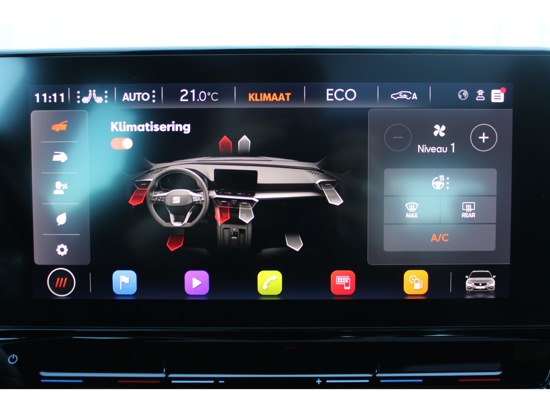 Aan boord van deze SEAT houden verschillende geavanceerde systemen voor u de weg in de gaten. Ze waarschuwen u voor noodsituaties en kunnen in een aantal gevallen ook zelf ingrijpen. De actuele snelheidslimiet, een inhaalverbod en andere verkeersborden; de verkeersborddetectie ondersteunt u tijdens elke rit. Deze SEAT Leon Sportstourer is ook behulpzaam als het gaat om een rechte koers. Het Lane-keeping systeem signaleert en corrigeert als u onbedoeld de rijstrooklijnen dreigt te overschrijden. Botsingen met een voorligger gebeuren relatief vaak. De forward collision warning slaat tijdig alarm als dat risico ontstaat, zodat u kunt ingrijpen. Bovenop deze veiligheidsfeatures heeft deze SEAT bovendien dodehoekdetectie, hill hold functie, vermoeidheidsherkenning, autonoom remsysteem en bandenspanningcontrolesysteem.