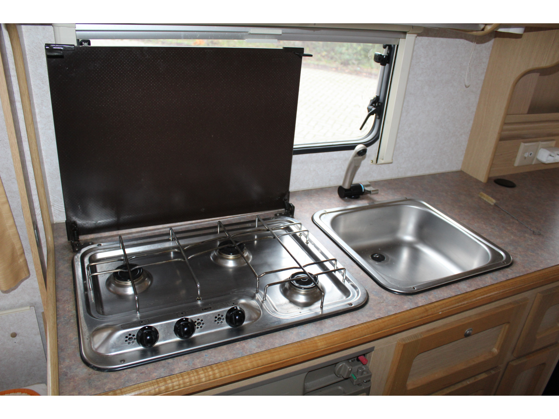 Keukenblok met gasfornuis en spoelbak.