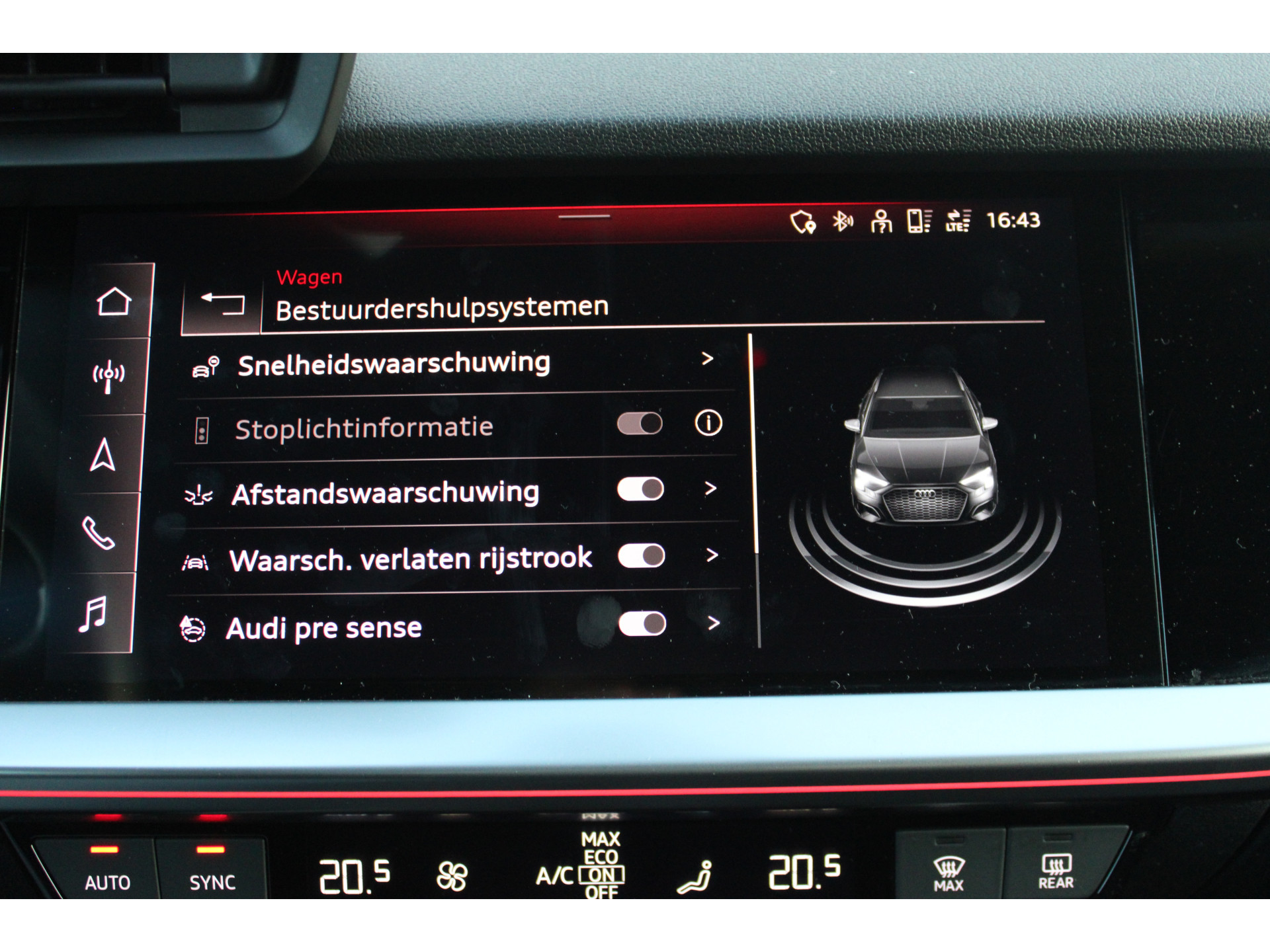 Zoals u mag verwachten van deze Audi A3 Sportback is hij uitgerust met een reeks aan actieve veiligheidssystemen. Onderweg fungeert de verkeersbord-detectie als het ware als uw bijrijder en attendeert u op de verkeersborden langs de weg. Keep your lane? Het Lane-keeping systeem zorgt er automatisch voor. Om de veiligheid extra te vergroten, heeft deze Audi A3 Sportback Brake Assist. In een noodsituatie treedt dit hulpremsysteem in werking wanneer extra remkracht nodig is.