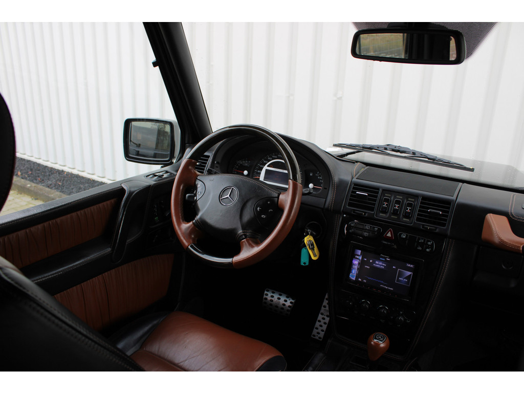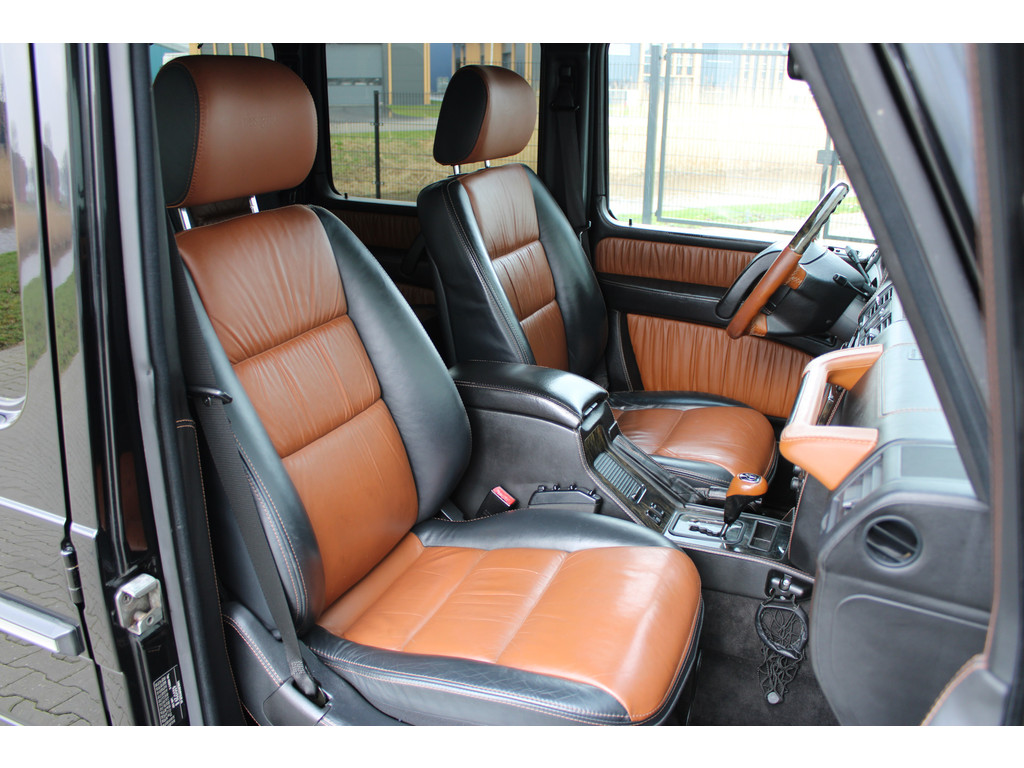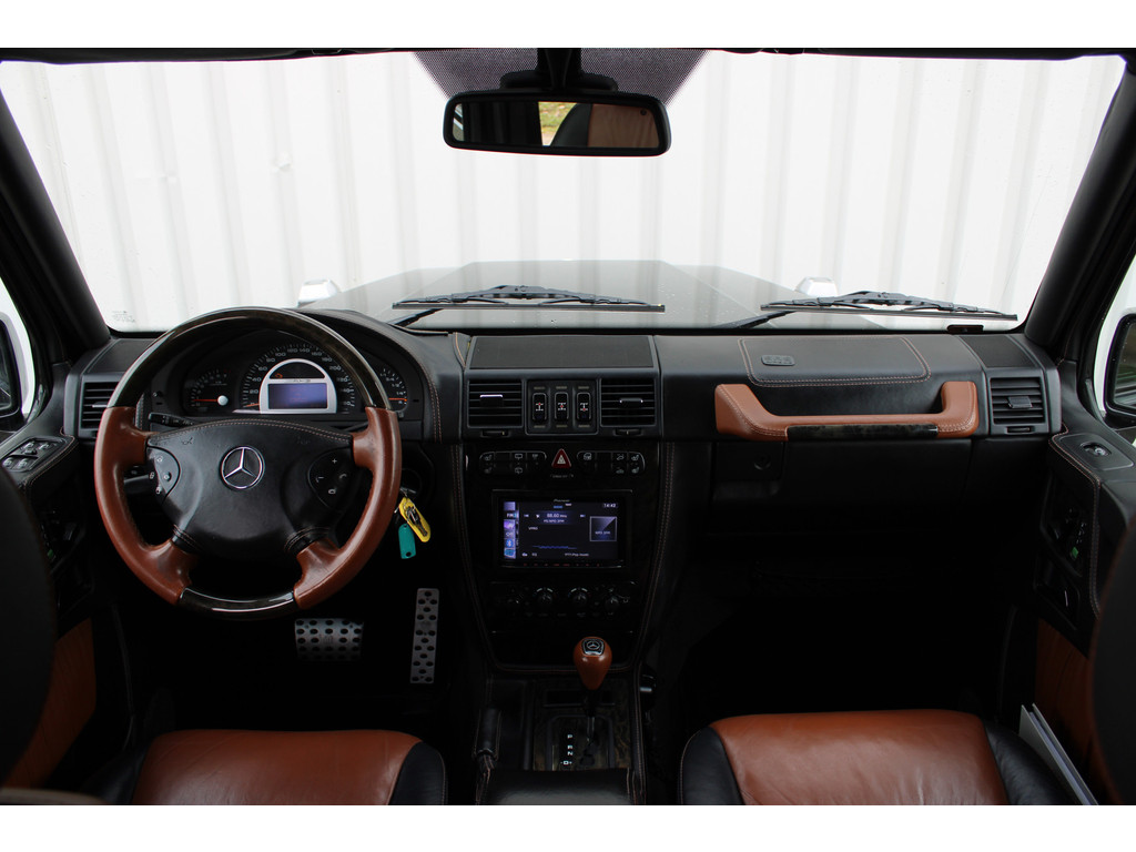 U merkt het aan de look and feel van deze auto: dit is kwaliteit. De Mercedes-Benz G-klasse is ontworpen volgens de Duitse opvattingen van kwaliteit en degelijkheid, maar biedt tegelijk een hoge mate van comfort en uitstekende rijkwaliteiten. Ten opzichte van het standaard model onderscheidt deze Mercedes-Benz zich met sportieve AMG-styling. Een achtcilinder benzinemotor en een automatische transmissie zorgen samen voor een snelle en comfortabele rijervaring. Daglicht valt ongehinderd naar binnen via het elektrisch bediend glazen panorama dak en laat het lederen interieur mooi tot zijn recht komen. Comfort of luxe? Wij denken allebei! U past de stoelen moeiteloos aan, ze zijn elektrisch in te stellen en hebben bovendien een geheugen. Voor en achter: iedereen dezelfde luxe. Vandaar de verwarmde achterbank. U wordt in deze auto ook getrakteerd op AMG-styling, sportonderstel, warmtewerend glas, zwarte hemelbekleding, neerklapbare achterbank en sportuitlaat.